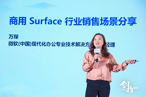 微軟(中國)現(xiàn)代化辦公專業(yè)技術(shù)解決方案部總經(jīng)理萬琛女士給我們帶來了商用 Surface行業(yè)銷售場景分享,包括周大福、藍蛙等。